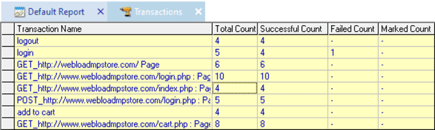 Checking the boxes on the “Functional testing” tab tells the WebLOAD load generator to make every page request in the script to be a transaction named “GET_”-URL or “POST_”-URL. But apart from these, the transactions the engineers created are also there. Each row also shows the “total count,” “successful count,” and “failed count” for each page or transaction.