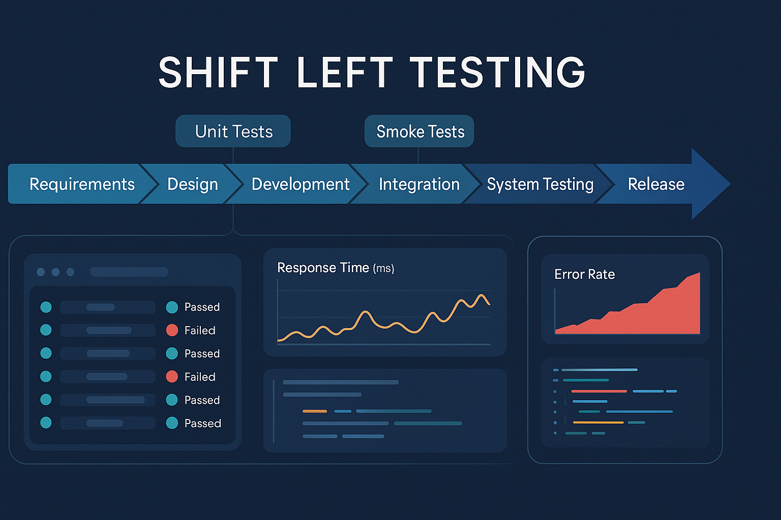In a shift left model, the testing entry point moves to stages 2–3: design reviews with testable acceptance criteria, unit and API contract tests during development, and automated performance smoke tests triggered at integration. The defect’s travel distance, and therefore its remediation cost, shrinks dramatically.
